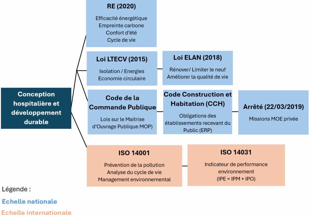 Le contexte réglementaire de la conception hospitalière est très singulier, et les recherches réalisées seront axées sur le développement durable. Sont notamment obligatoires : les lois ELAN et LTECV, la Réglementation Environnementale (RE2020). Les codes de la commande publique et de la construction et de l’habitation sont également très utiles et facilitent la réalisation des projets de conception hospitalière. D’un point de vue non obligatoire, les normes internationales ISO 14001 et ISO 14031 peuvent être appliquées dans une démarche d’intégration des exigences environnementales.