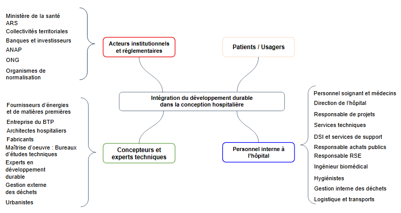 Notre projet va porter sur la conception et l’exploitation hospitalières et le développement durable de manière générale en prenant en compte les points de vue de nombreux acteurs. Il est possible de subdiviser le projet en quatre grandes catégories de parties prenantes. Dans un premier temps, les professionnels de santé qui travaillent à l’hôpital semblent être la partie prenante la plus concernée, avec un impact majeur de la conception sur l’exécution quotidienne de leurs tâches. En effet, la conception aura un impact sur l’organisation interne, et donc l’efficacité, la sécurité et, par conséquent, la qualité des soins. La partie prenante des patients est ainsi étroitement liée à celle des professionnels de santé. En effet, si les circuits et flux de personnels sont optimisés, avec une réduction des temps de déplacement, alors le temps dédié aux patients, à leur soin et au suivi de leur état global de santé est majoré. De plus, assurer le confort thermique et acoustique des espaces de l’hôpital a des conséquences sur le quotidien du patient lors de son séjour à l’hôpital. Enfin, les institutions administratives et de direction ont des rôles de pilotage, de planification et de politique. Parmi elles, l’Agence Régionale de Santé (ARS), qui a des fonctions de contrôle de la qualité et d’orientation des différents financements. Cette dernière fait souvent suite à la politique nationale de santé définie par le Ministère de la Santé. Entre ces deux organisations, les collectivités territoriales interviennent d'un point de vue financier, avec une participation plus ou moins élevée au projet de conception. Ces administrations ont également un impact sur les concepteurs et experts techniques soumis à des réglementations. Parmi eux se trouvent les architectes hospitaliers, bureaux d’études, urbanistes ainsi que tous les fournisseurs de matières premières, d’énergie, et les fabricants de dispositifs médicaux. La Figure 3 ci-dessous représente une cartographie des acteurs de la conception hospitalière.