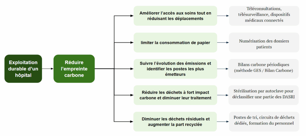 Lorsque la gestion des déchets est évoquée, il est important de considérer les différents types : les Déchets d’Activités Économiques (DAE) concernant tout ce qui n’est pas directement lié aux soins comme la gestion administrative, les services de restauration etc. , les Déchets d’Activités de Soins (DAS) avec les déchets médicaux, les DASRI, les équipements et matériaux, les Déchets Assimilés aux Ordures Ménagères (DAOM) pour les déchets de bureaux, emballages etc. La réduction de l’empreinte carbone peut passer par la gestion des Déchets d’Activités de Soins à Risques Infectieux (DASRI) et le renforcement du tri sélectif. La Figure 5 ci-après présente un récapitulatif des considérations liées à l’exploitation de la conception hospitalière.