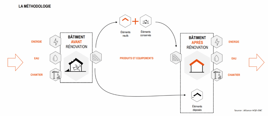 Dans le cas d’une rénovation, le cycle de vie peut être étudié de façon légèrement différente. La Figure 6 présente le principe d’économie d’énergie, d’eau et de chantier, ajoutés à des équipements et produits choisis de façon à optimiser l’utilisation de ces ressources après rénovation.
