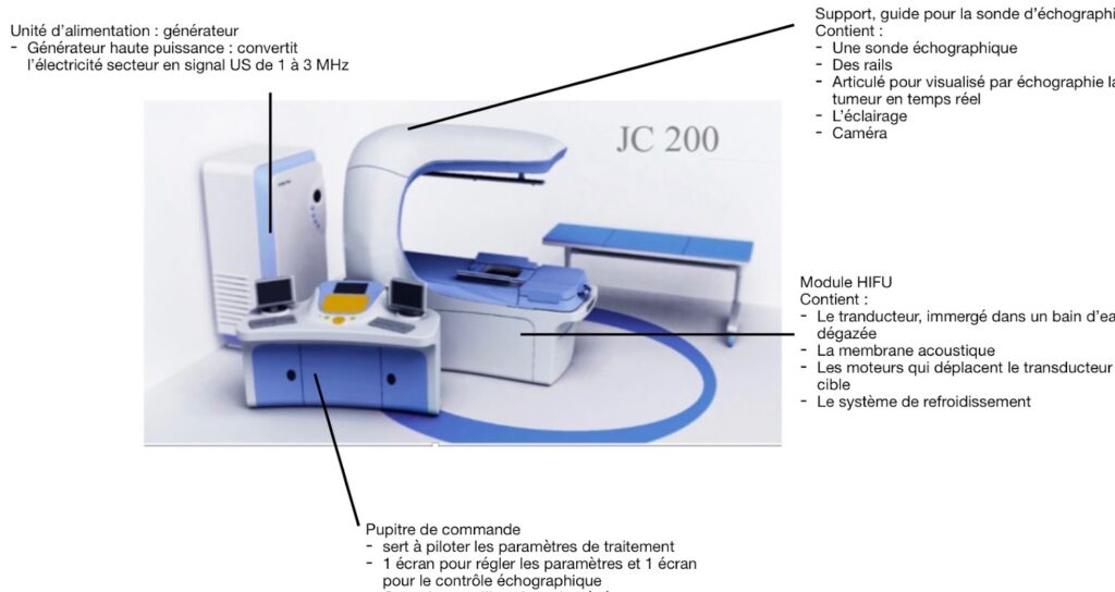 En ce qui concerne la sécurité, des capteurs thermiques assurent la protection du transducteur et de la peau, avec refroidissement actif. Le système mesure la puissance réfléchie pour détecter tout défaut de couplage ou présence d’air.