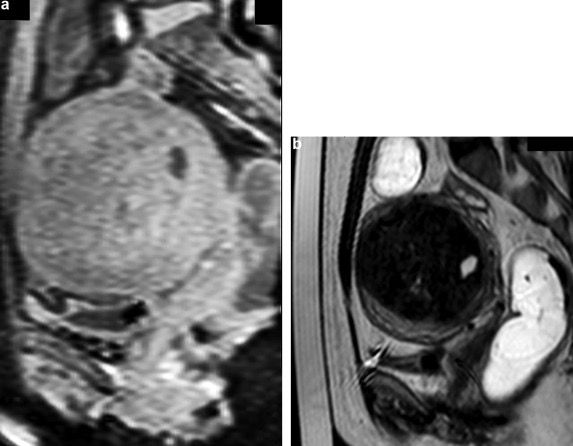 Figure 8 : IRM de fibrome utérin avant (gauche) et après (droite) traitement par HIFU. On observe un centre nécrotique à droite, symbole d’une thermodestruction par les ultrasons [27]