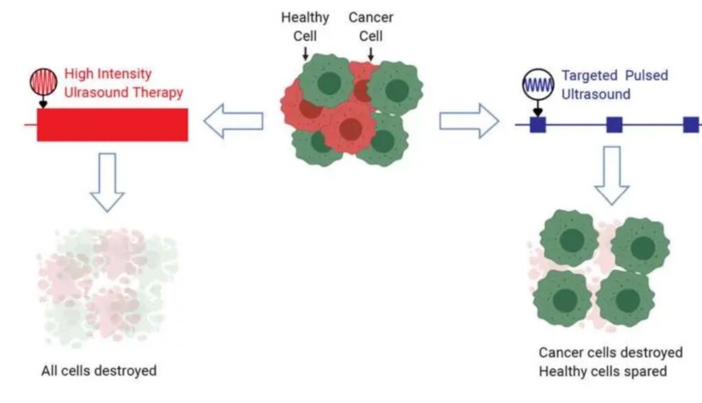“Les ultrasons pulsés ciblés tirent parti des propriétés mécaniques uniques des cellules cancéreuses, afin de les détruire tout en épargnant les cellules saines. Ce schéma compare l’impact d’une thérapie par ultrasons de haute intensité (à gauche) avec le nouveau type de thérapie proposé, soit à ultrasons de faible intensité (à droite). Dans ce dernier cas, les cellules saines sont épargnées. Crédits : David Mittelstein”