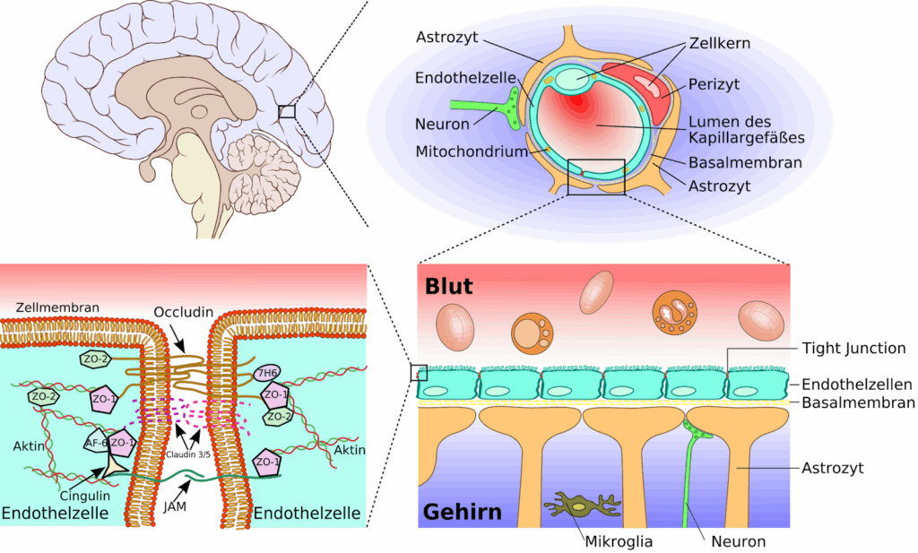 Figure 13 : Schéma de la barrière hémato-encéphalique et du passage des molécules au travers de celle-ci [21]