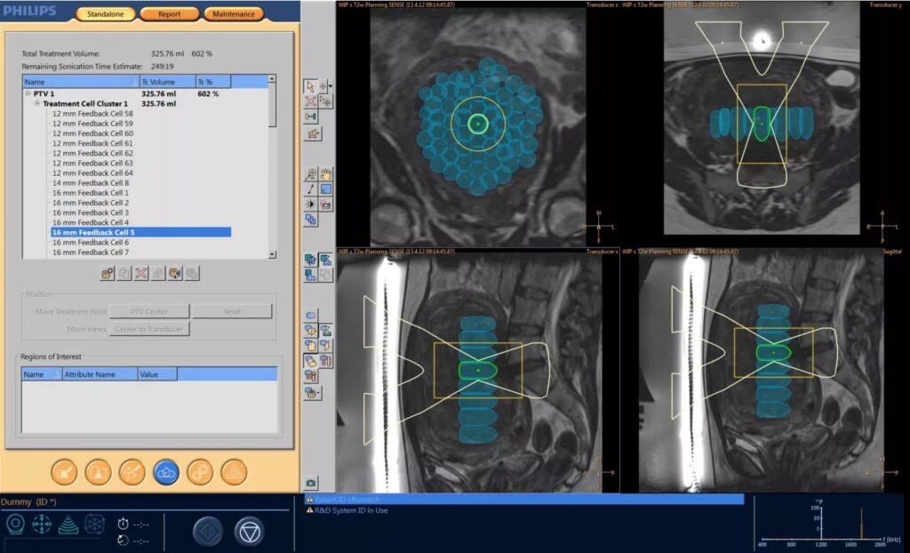 L’interface et la commande logicielle du système HIFU reposent sur un poste opérateur équipé d’un logiciel de planification incluant la segmentation anatomique et la définition du volume cible, à l’image des traitements de radiothérapie (figure 4 et figure 5). Ce logiciel contrôle automatiquement la puissance, la durée, la position du foyer et la fréquence de tir. Une boucle de sécurité interrompt le traitement en cas de surchauffe, de déviation du faisceau ou d’anomalie de réflexion. Le transducteur peut être robotisé pour un positionnement précis, tandis que l’interface affiche en continu les données d’imagerie et de température.