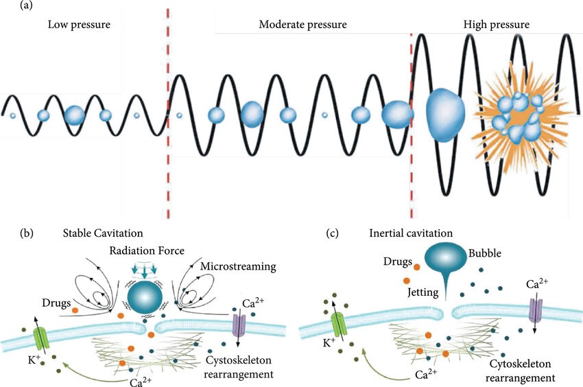 Figure 7 : Evolution des bulles de cavitation selon la pression acoustique : cavitation stable vs cavitation inertielle et leurs effets cellulaires [25]