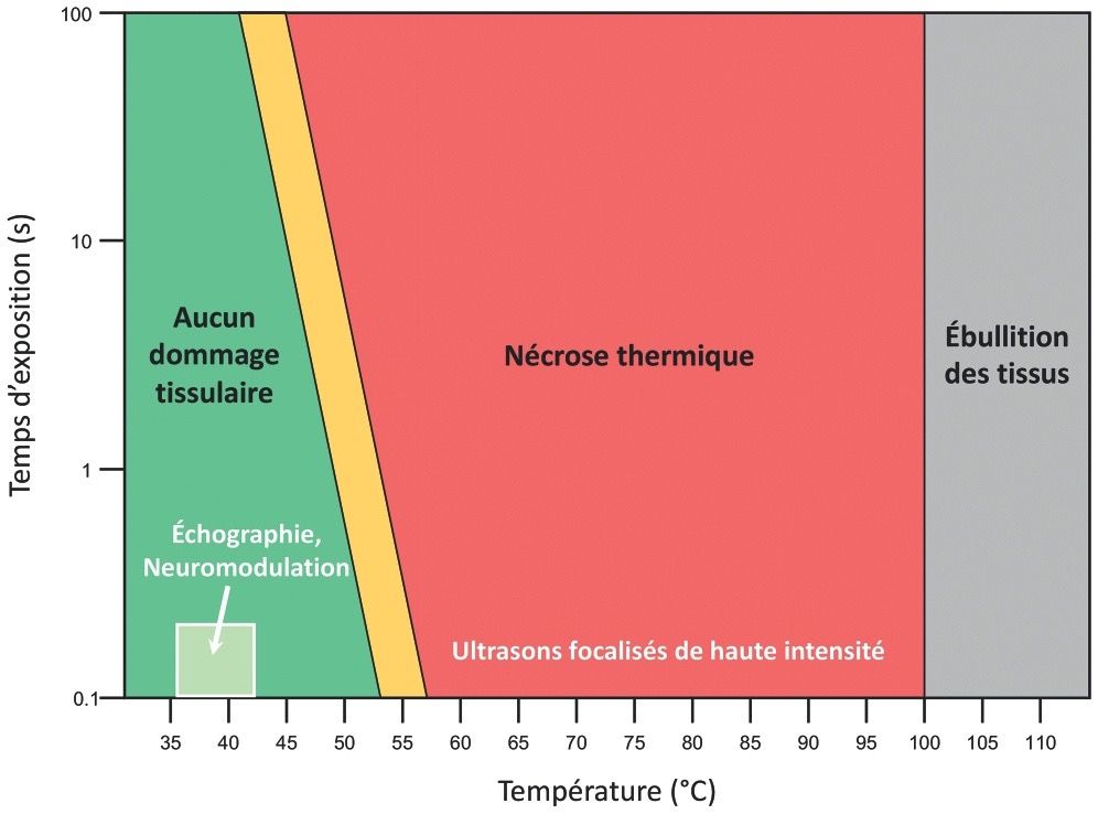 Lorsqu’une onde US de haute intensité est focalisée en un point unique, l’énergie acoustique déposée dans les tissus est en majorité convertie en chaleur par absorption. Au foyer, la densité de puissance est telle que la température peut atteindre 60 à 90°C en quelques secondes, seuil à partir duquel la coagulation protéique, la dénaturation des structures cellules et une nécrose de coagulation apparaissent de manière localisée. L’effet se produit dans quelques mm³, tandis que les tissus traversés avant le point focal ne subissent qu’un échauffement modéré grâce à la focalisation du faisceau et la différence importante d’intensité entre le foyer et les zones périphériques [20].
