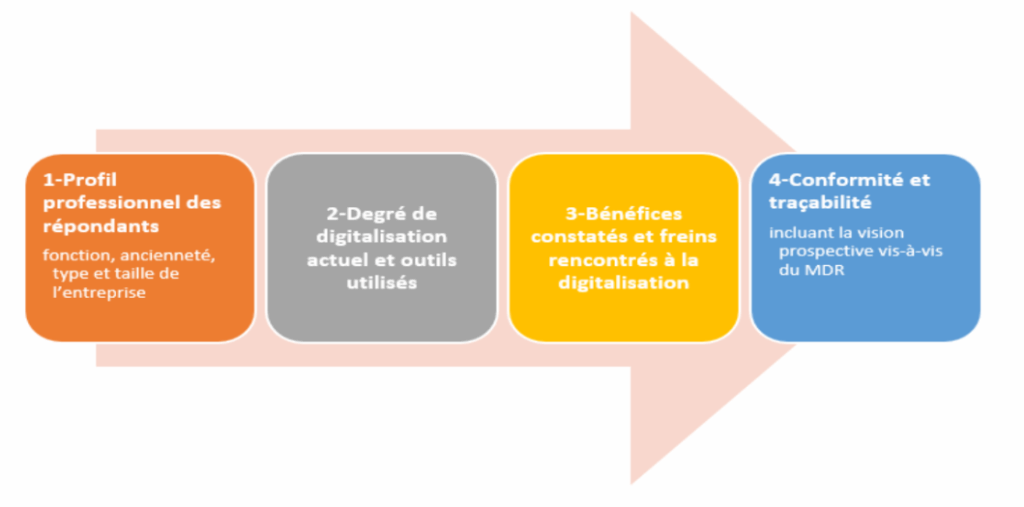 Afin de compléter les entretiens réalisés avec des experts du domaine, un questionnaire anonyme a été conçu (voir annexe 3) et distribué auprès des professionnels du secteur des dispositifs médicaux. Sa rédaction s’est appuyée directement sur les enseignements tirés des entretiens, qui ont permis d’identifier les problématiques quotidiennes, les écarts entre exigences réglementaires et capacités numériques, ainsi que les attentes en matière de digitalisation.