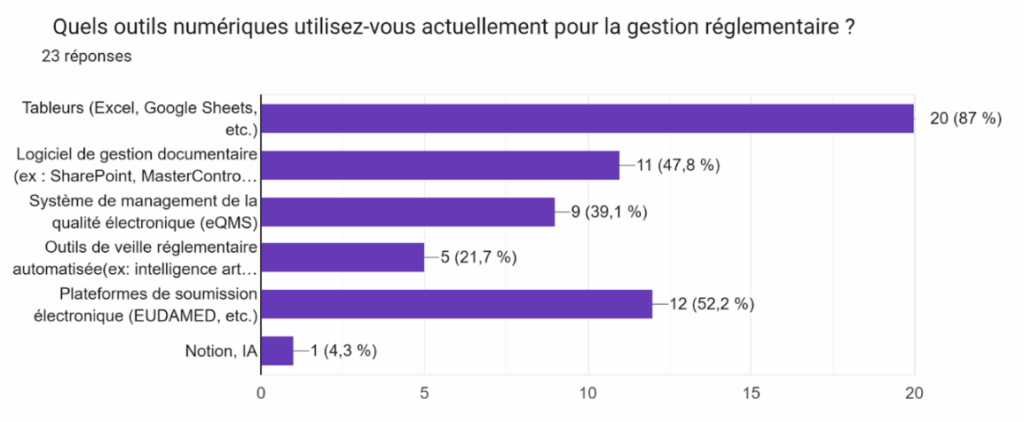 - Les outils actuellement utilisés (tableurs, eQMS, logiciels de gestion documentaire, plateformes de soumission, outils d’IA, etc.)