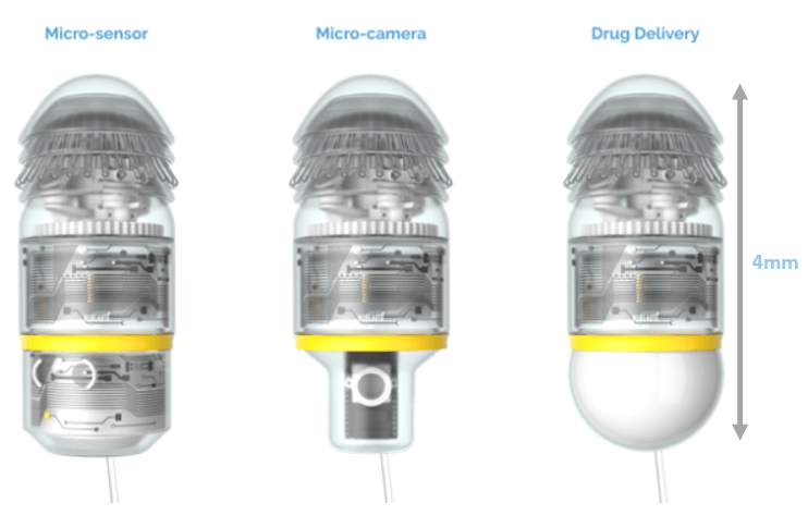 Figure 15 : Représentation de différentes configurations du microrobot Robeauté en fonction de l’objectif clinique : dépôt d’électrode (Micro-sensor), visualisation des structures (Micro-camera), administration de traitements (Drug Delivery) (Source : Sorbonne Université, 2022) [44]