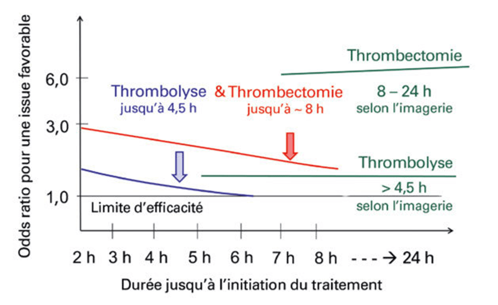 Bien que basés sur plusieurs études, ces délais peuvent varier en fonction des cas. Ainsi, tous les patients ayant subi un AVC ischémique aigu invalidant dont les symptômes sont apparus il y a plus de 6 heures, mais moins de 24 heures au moment de la prise en charge, doivent être examinés rapidement pour évaluer leur admissibilité à une imagerie neurovasculaire. En fonction de l’atteinte tissulaire, l’intérêt d’une thrombolyse et/ou d’une thrombectomie tardive est évalué. Cependant, ces procédures personnalisées qui sont réalisées pour un odds ratio inférieur ou égal à 1 sont souvent associées à une probabilité d’atteinte fonctionnelle post-AVC élevée.