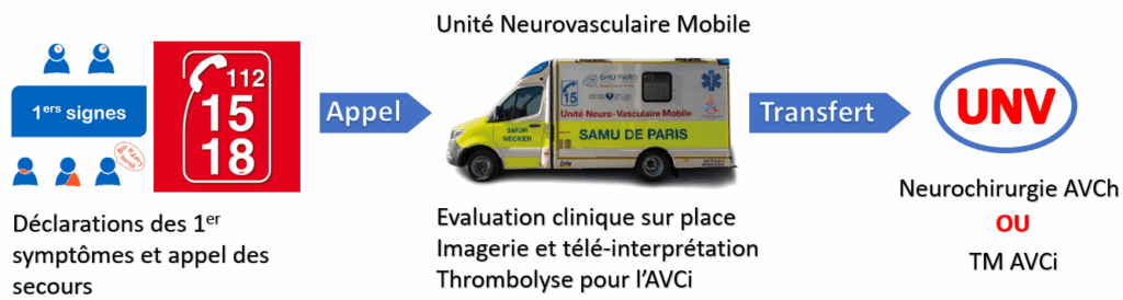L’une des innovations les plus prometteuses consiste à amener les outils diagnostic et thérapeutiques au plus près des patients dans des Mobile Stroke Units (MSU) ou Unité Neurovasculaire Mobile (UNVM). Ce sont des ambulances avec une équipe spécialement formée à bord pour l’utilisation d’un scanner cérébral, d’un laboratoire biologique d’appoint et d’une solution de télémédecine reliée aux centres experts AVC. L’utilisation d’UNVM à Berlin et aux Etats-Unis a permis une réduction des délais de prise en charge des patients et une réduction du handicap par rapport aux parcours habituels. Les études ont notamment démontré une augmentation de 22% de l’accès à la thrombolyse passant de 79,5 % des patients éligibles à 97,1 %. Le temps médian pour l'initiation de la thrombolyse a également pu être raccourci en passant de 108 à 72 minutes.