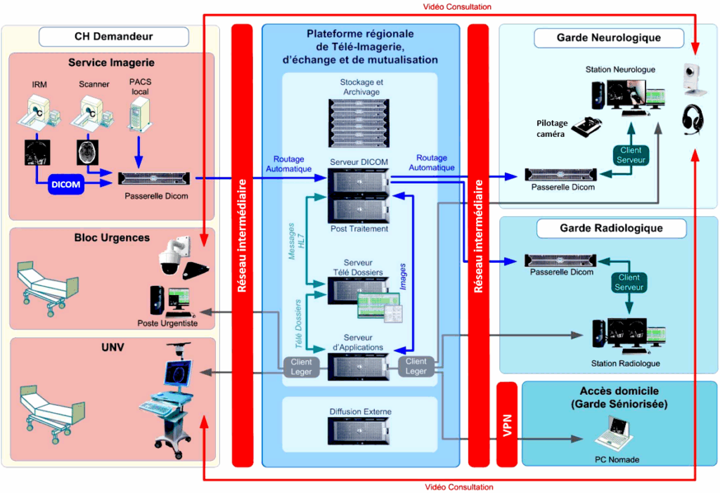 - Après un examen d’imagerie médicale, les acquisitions sont routées vers une plateforme dédiée et le médecin urgentiste peut solliciter l’avis d’un neurologue situé sur un site de recours à distance pour une télé-expertise.