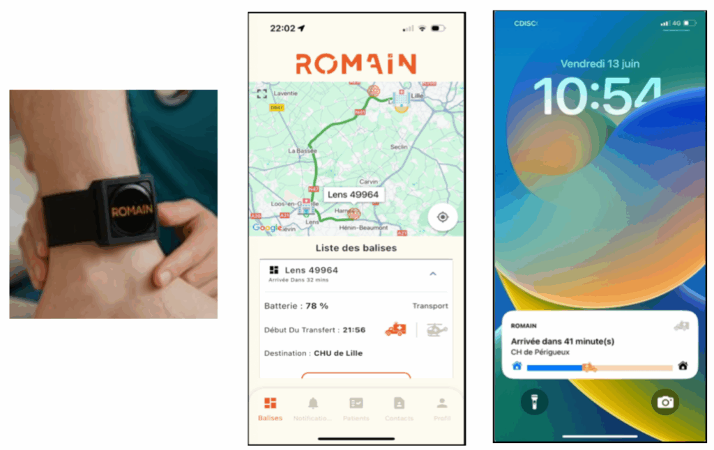 ROMAIN est une solution mobile de géolocalisation en temps réel du patient pendant son transfert inter-hospitalier ou également en pré-hospitalier (en cours d’étude). Un bracelet connecté est mis en place au niveau de la cheville du patient. Via un système sécurisé tout au long de son transfert, il est possible d’avoir la géolocalisation du patient (que ce soit pour un transfert terrestre mais aussi héliporté). Cela permet donc aux équipes médicales de prévoir avec précision l’arrivée de ce dernier (Figure 13).