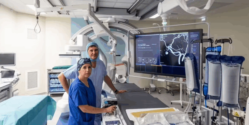 Figure 14 : Les docteurs Xavier Barreau et Eva Jambon au sein de la salle d’imagerie interventionnelle désormais intégrée aux urgences de l’hôpital Pellegrin : une première en France. Crédit photo : Thierry David/SO (Source : Sud ouest, 2025) [43]