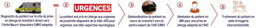 Le maillage territorial organisé en étoile autour des UNV reconnues par l’ARS (Mothership) intègre ainsi les établissements de santé selon un modèle de “drip” : diagnostic et thrombolyse intraveineuse dans un centre de proximité, and “ship” : transfert vers un centre expert pour une neurochirurgie. Ces circuits de prise en charge sont limités par des difficultés liées à la coordination des professionnels de santé entre les différentes étapes. De même, l’accès à une imagerie diagnostique, à une expertise neurovasculaire ou plus largement à des moyens thérapeutiques adaptés est problématique. Ainsi, en dépit de l’efficacité des procédures thérapeutiques actuelles, c’est l’accès aux soins qui est entravé pour une grande majorité des patients victimes d’AVC.