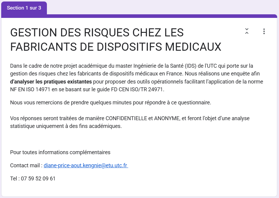 Ce sondage a été diffusé auprès de plusieurs fabricants de dispositifs médicaux. L’objectif est d’évaluer la mise en œuvre concrète de la norme NF EN ISO 14971 :2019 et de son guide FD CEN ISO/TR 24971 :2020, d’identifier les méthodes d’analyse utilisées, les difficultés rencontrées, ainsi que les attentes des acteurs en matière d’outils pédagogiques ou opérationnels pour la maîtrise des risques.