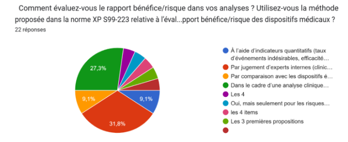 The results show that the ISO 14971 standard is generally applied satisfactorily, but that its application guide is still only used to a limited extent. The most commonly used methods remain FMEA, criticality matrices and internal checklists, which are mainly based on qualitative approaches. Respondents expressed a need for educational and operational tools to harmonise practices and improve understanding of regulatory requirements.