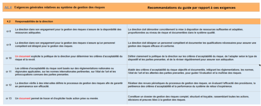 | Autorités compétente et Organismes notifiés | Harmoniser la compréhension de l’évaluation des risques, exigé une documentation rigoureuse de la maîtrise des risques basée sur des méthodes solides, évaluation le rapport bénéfice/risque afin d'assurer une sécurité des patients uniforme [3,4]. |