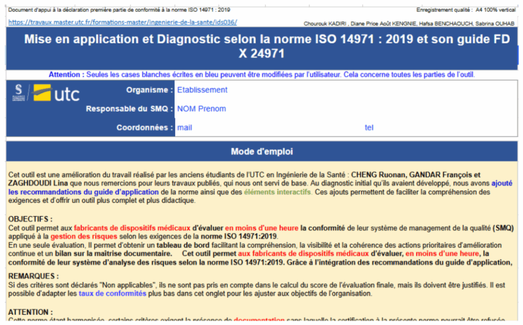 A rappeler pour tout usage : D. KENGNIE, C. KADIRI, S. OUHAB, H. BENCHAOUCH « Analyse des méthodes de gestion des risques des fabricants de DM et proposition d’un outil d’aide à l’application du guide FD CEN ISO/TR 24971 », Université de Technologie de Compiègne (France), Master Ingénierie de la Santé, Mémoire de Projet, janvier 2026, https://travaux.master.utc.fr/, réf n° IDS301, https://travaux.master.utc.fr/formations-master/ingenierie-de-la-sante/ids301/, https://doi.org/10.34746/ids301