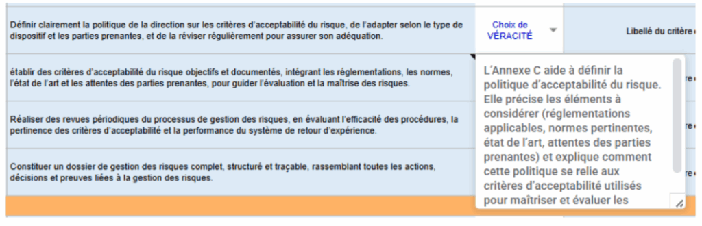 Figure 11 : Extrait de l’outil d’aide à l’application de l’ISO 14971 intégrant des bulles d’information explicatives [source : Auteures]