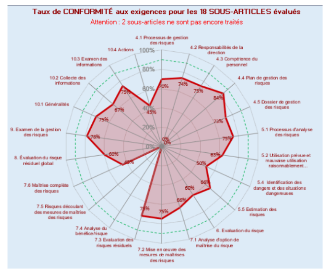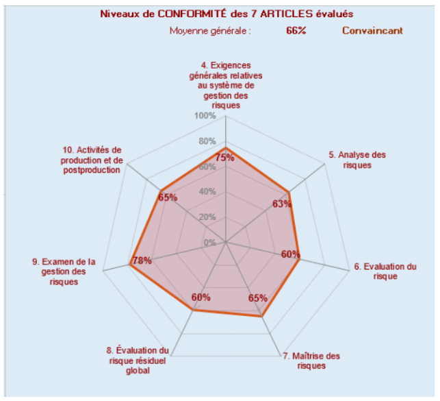 Un bilan global(Figure 12) est ensuite présenté sous la forme d’un graphe radar, montrant le niveau de conformité en pourcentage pour l’ensemble des sous-articles évalués de la norme, avec la possibilité d’ajouter des commentaires sur les résultats obtenus.