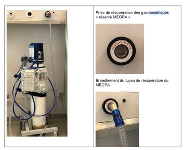 Figure 11 : Chariot MEOPA et prise de récupération des gaz narcotiques “réservé MEOPA” (Source : Hôpitaux Universitaires de Genève)