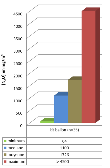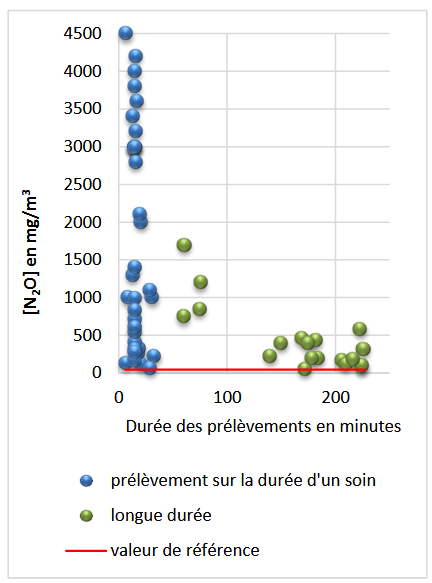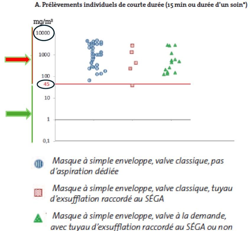 Le fait que de nombreux points, tous masques confondus, restent au-dessus de la ligne de 45 mg/m³ montre que les soignants sont régulièrement exposés à des niveaux élevés. Le graphique justifie la recommandation de privilégier les dispositifs les plus performants (valve à la demande associée à un système d’aspiration type SEGA) et de compléter par une bonne ventilation des locaux et des mesures organisationnelles (formation, choix des indications, durée minimale de soin) pour réduire les expositions au N₂O ou l’usage du masque à double enveloppe.