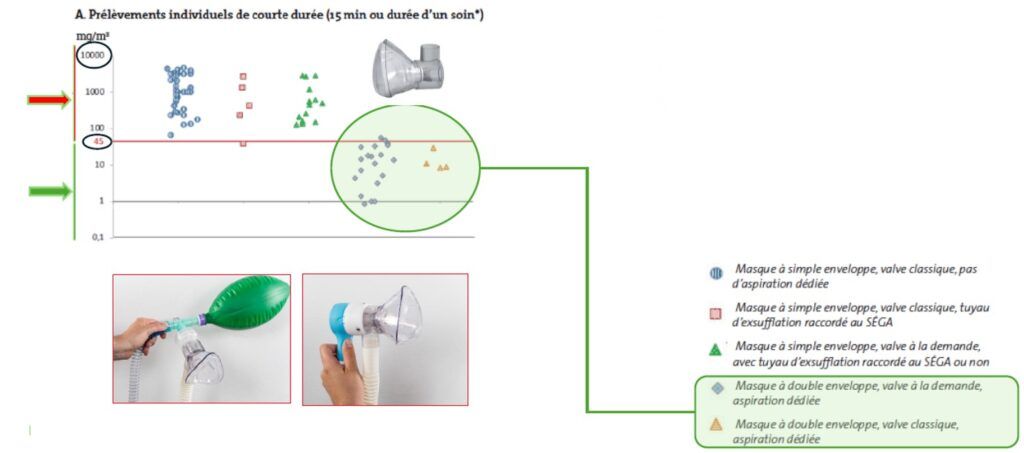Le masque à double enveloppe fait passer la majorité des mesures en dessous du seuil de 45 mg/m³, Il met surtout en évidence l’intérêt des masques à double enveloppe avec aspiration dédiée pour limiter l’exposition des soignants au MEOPA.